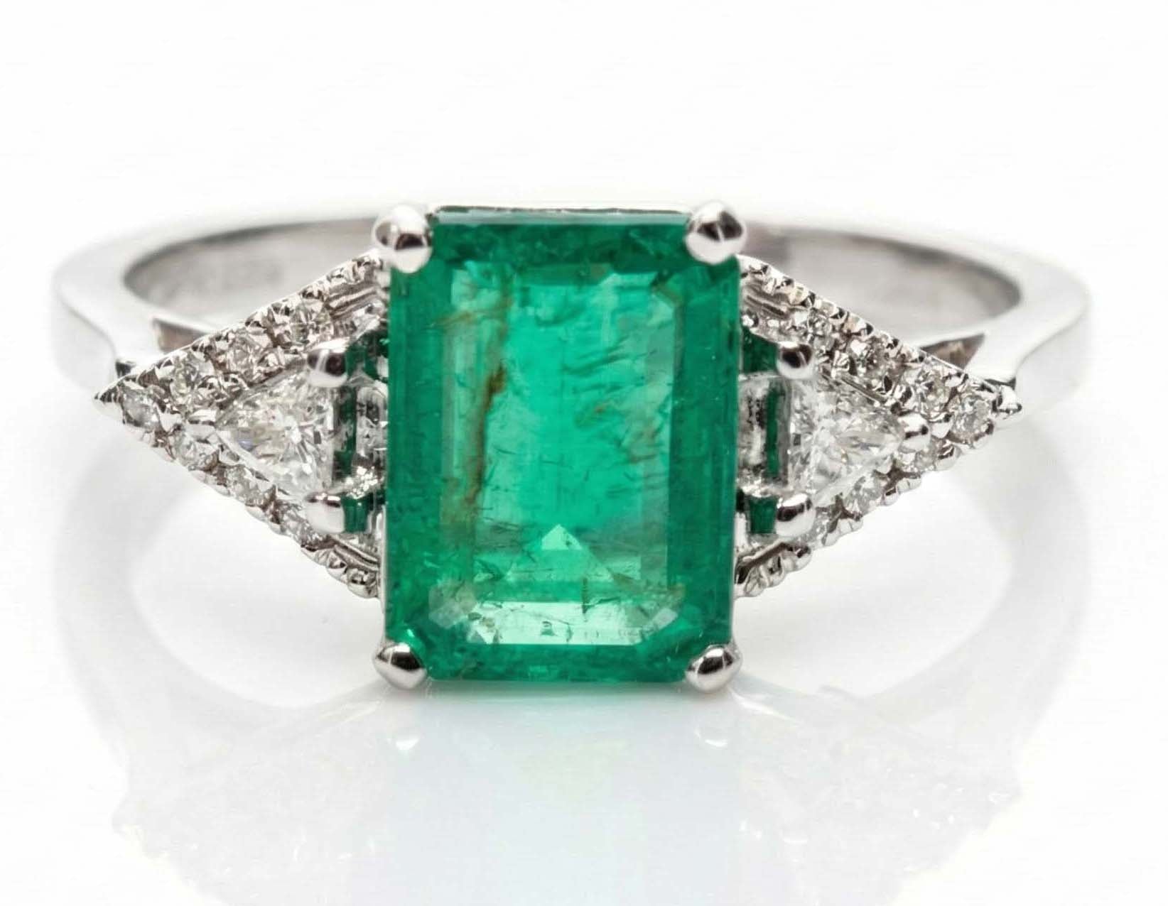 A breathtaking statement piece, this 18ct white gold ring showcases a vivid emerald-cut emerald at its centre, glowing with the rich green colour that makes this gemstone so eternally sought after. The emerald is framed by elegant trillion-cut diamonds on each shoulder, each further outlined with a halo of brilliant-cut diamonds that add exceptional sparkle and a refined geometric balance.